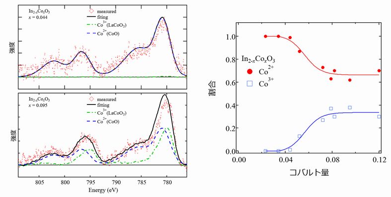 In2O3のInをCoで一部置換したIn2-xCoxO3において,Coイオンの24dおよび8bサイト占有,価数状態,およびスピン状態調べました.製品のX線粉末回折パターンのRietveld解析により,Co2+イオンとCo3+イオンはそれぞれ24dサイトと8bサイトを占有する傾向があることが明らかになりました.