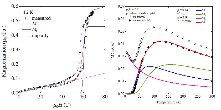 ペロブスカイト酸化物LaCoO3系のCoイオンのスピン状態を最大磁場67 Tまでの磁化測定から調べました.LaCoO3は,4.2 K, 60 T付近で磁気転移を示しました.これは一部のCoイオンが低スピン状態から高スピン状態に転移したと考えられます.
