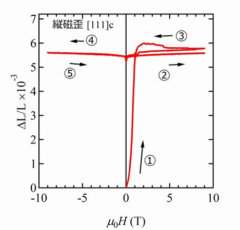 磁歪は磁場の2乗に比例し、非磁性基底状態と磁性励起状態間のスピン状態遷移モデルでよく説明できました。磁歪と磁化の圧力依存性を比較した結果、LaCoO3の磁気弾性現象を定量的に記述するには、格子体積のみで表現される弾性エネルギーでは不十分であることが示唆されました。