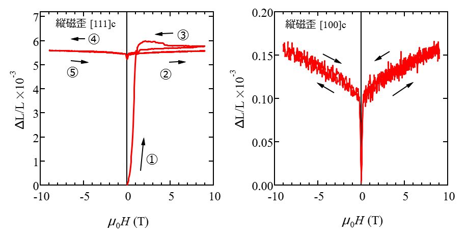 LaCoO3のパルス強磁場下での磁歪測定から、Co3+イオンのスピン状態遷移が磁気弾性効果に与える影響を考察しました。この知見は、現在の磁気形状記憶効果を示す(La,Sr)CoO3の研究へと発展させることができました。