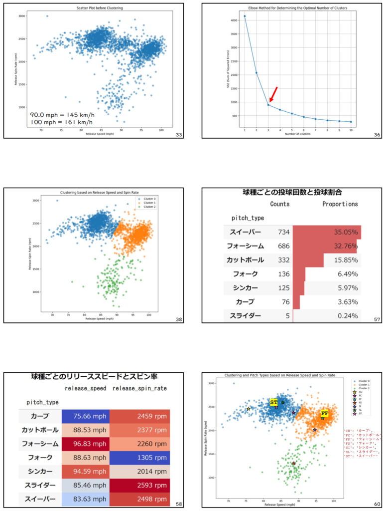 クラスタリング分析の結果、大谷翔平選手の投球データは3つのグループに分類されました。さらに、各グループが球種の違いによるものであることが明らかになりました。これにより、学生たちはクラスタリング分析の有用性を実感できたのではないでしょうか。下に示す図は、授業で使用したスライドの一部です。大谷翔平選手の投球データをリリーススピードとリリーススピン率の散布図で表現し、クラスタリングの結果を色分けして示しています。さらに、各グループが主にどの球種で構成されているかを凡例で示すことで、クラスタリングの結果と球種の関連性を明確に表現しました。学生たちはクラスタリング分析の実用性と有用性を直感的に理解することができたと期待しています。
