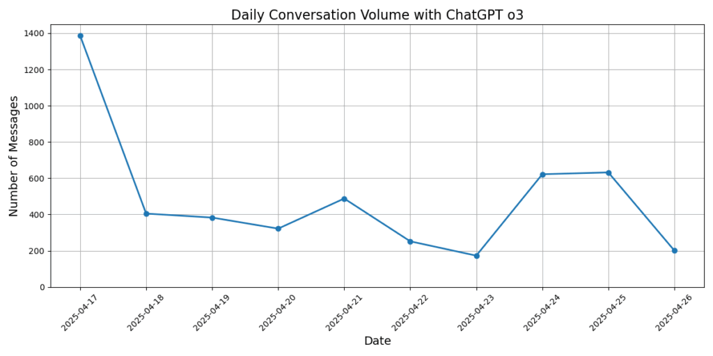 On April 17, 2025, a new model called “o3” was released for ChatGPT. It has been an incredibly enjoyable experience, expanding both the range and depth of what I can explore. The graph below visualizes my daily conversation volume with o3, based on data exported from the Data Controls. With the continuous discoveries and learning it supports, it feels unimaginable to have any limits on interaction.